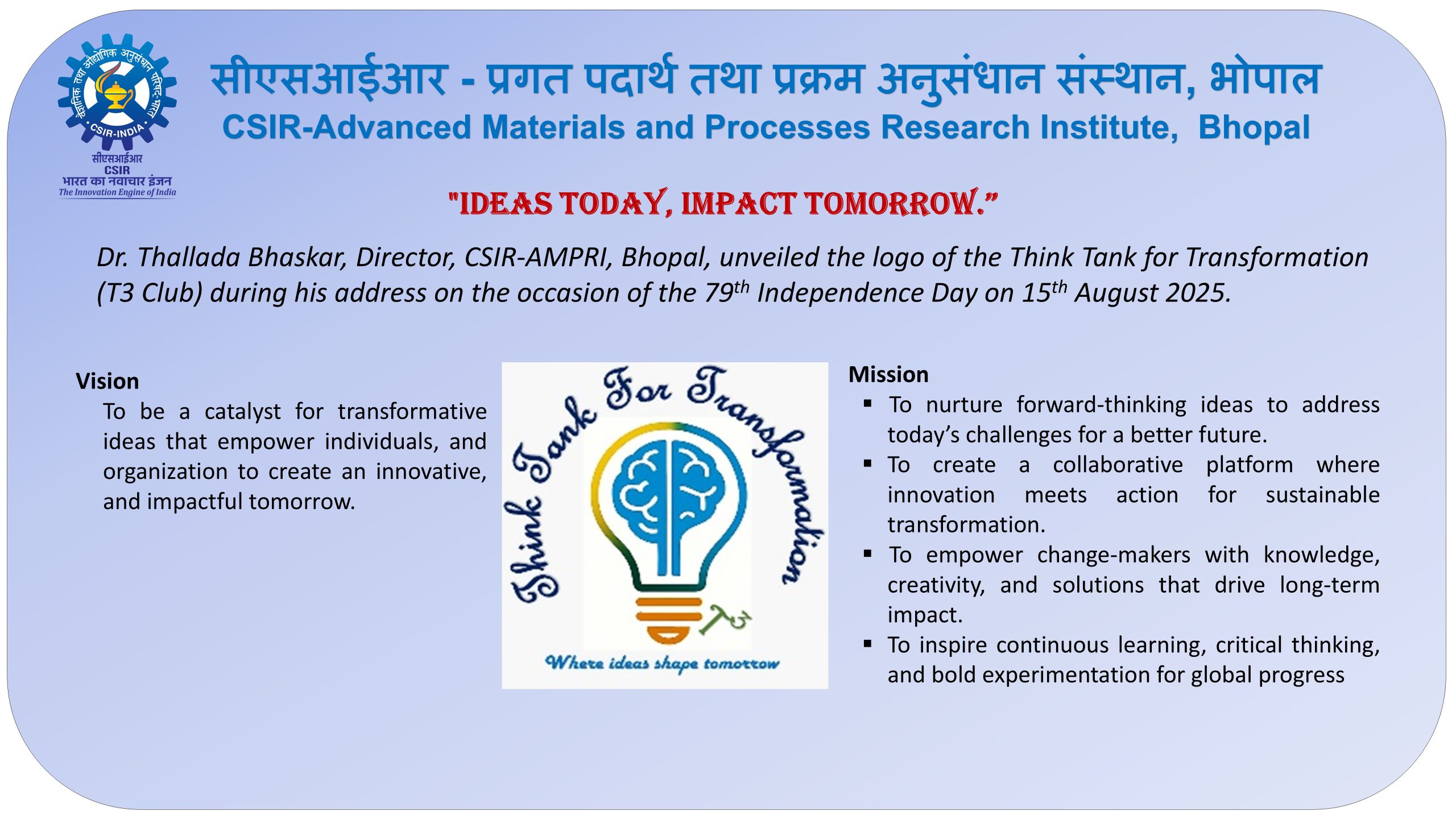 Welcome to CSIR-AMPRI, a premier research institute under the Council of Scientific and Industrial Research (CSIR), dedicated to pioneering work in advanced materials and process technologies.